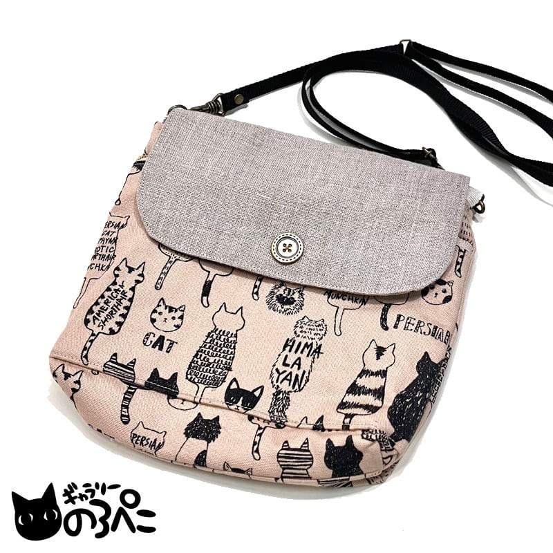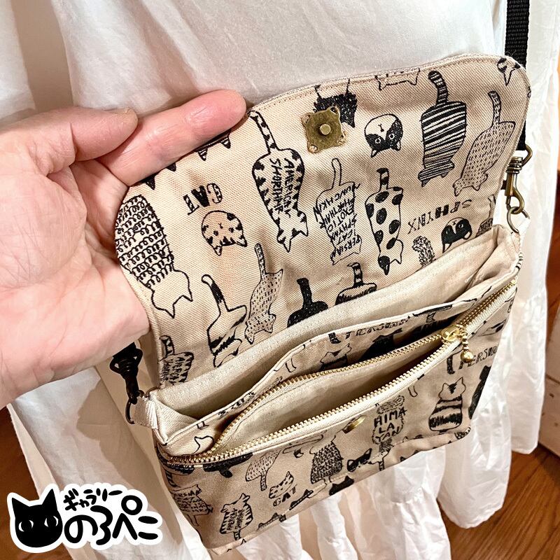 お座り猫のふた付きショルダーバッグ(ミルクティ色の猫柄コットンオックスと生成りリネンのショルダーバッグ) aa362-267