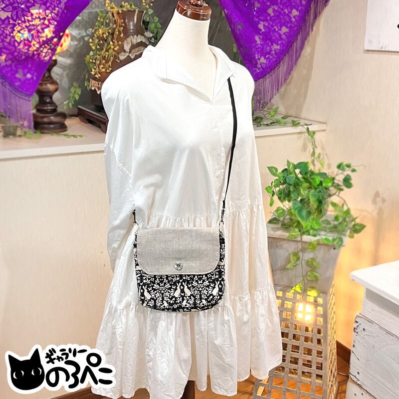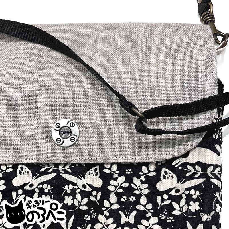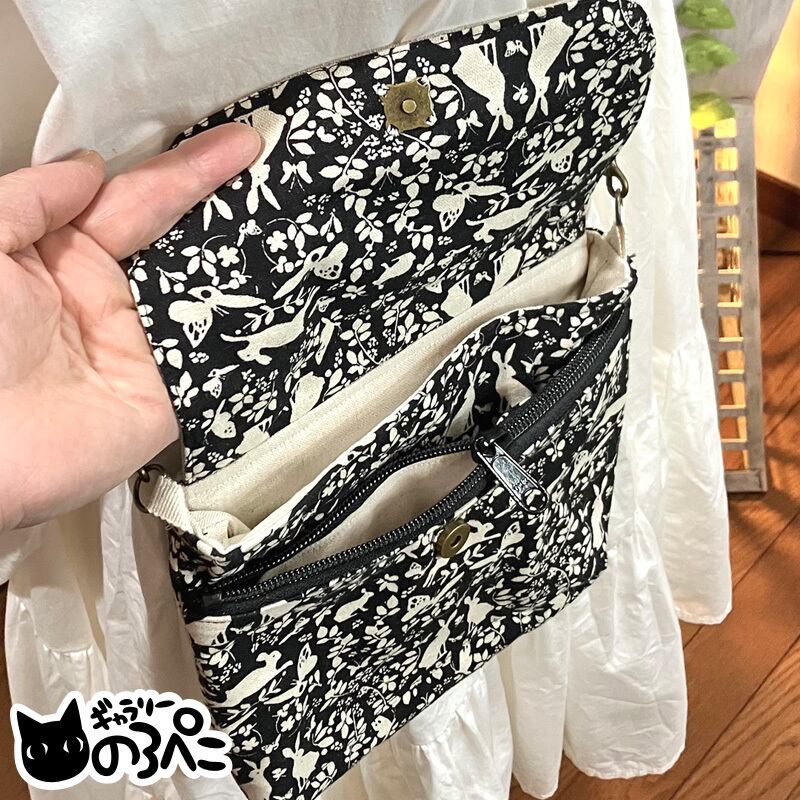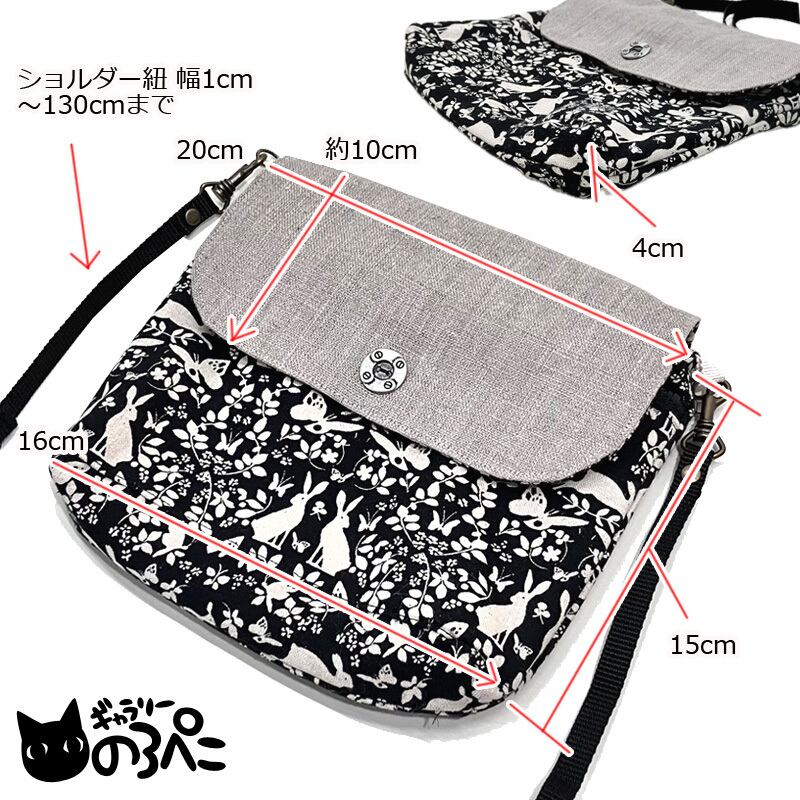 うさぎの森のふた付きショルダーバッグ(モノトーンのうさぎ柄コットンリネンキャンバスと生成りリネンのショルダーバッグ) aa362-269