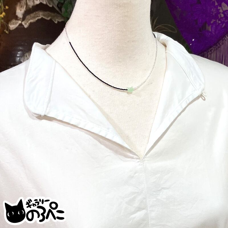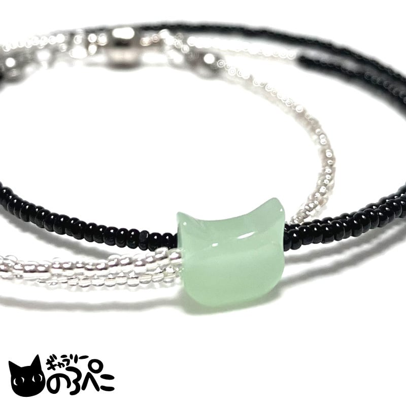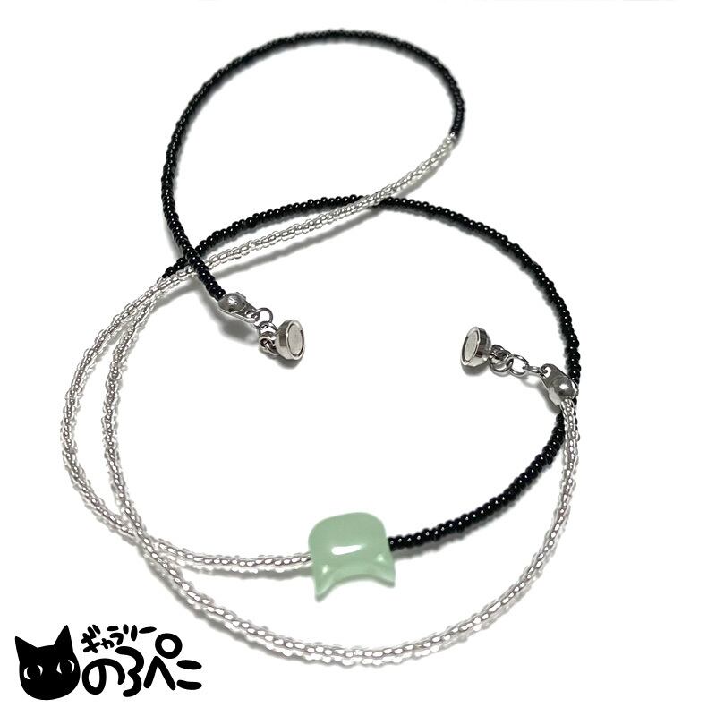 ブラックのビーズはつややかな光沢があり、シルバーのビーズは透明なガラスの内側に銀色が施されたタイプ。猫型のガラスビーズは翡翠のようなグリーンがやさしげです。