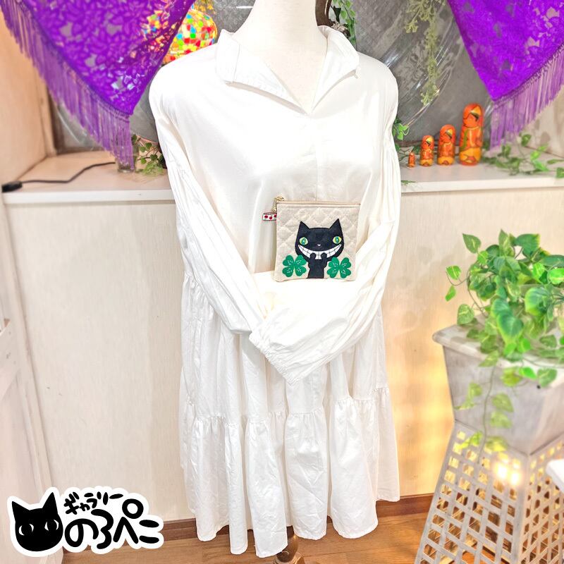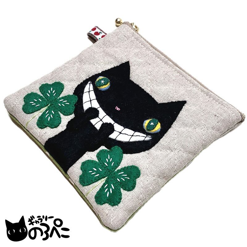 黒猫のイシシ君とクローバーのミニポーチ(コットンリネンキルティングの外ポケット付きポーチ) D4029-721
