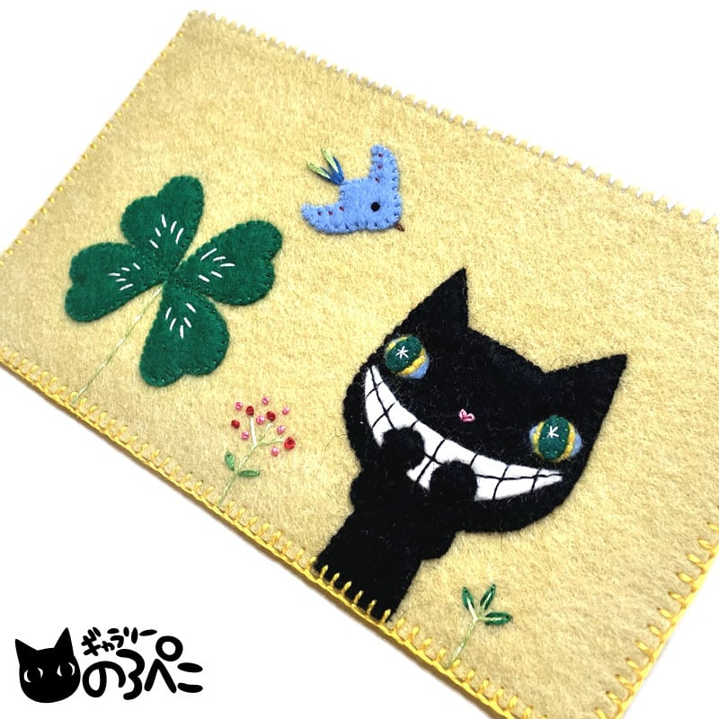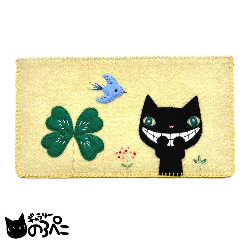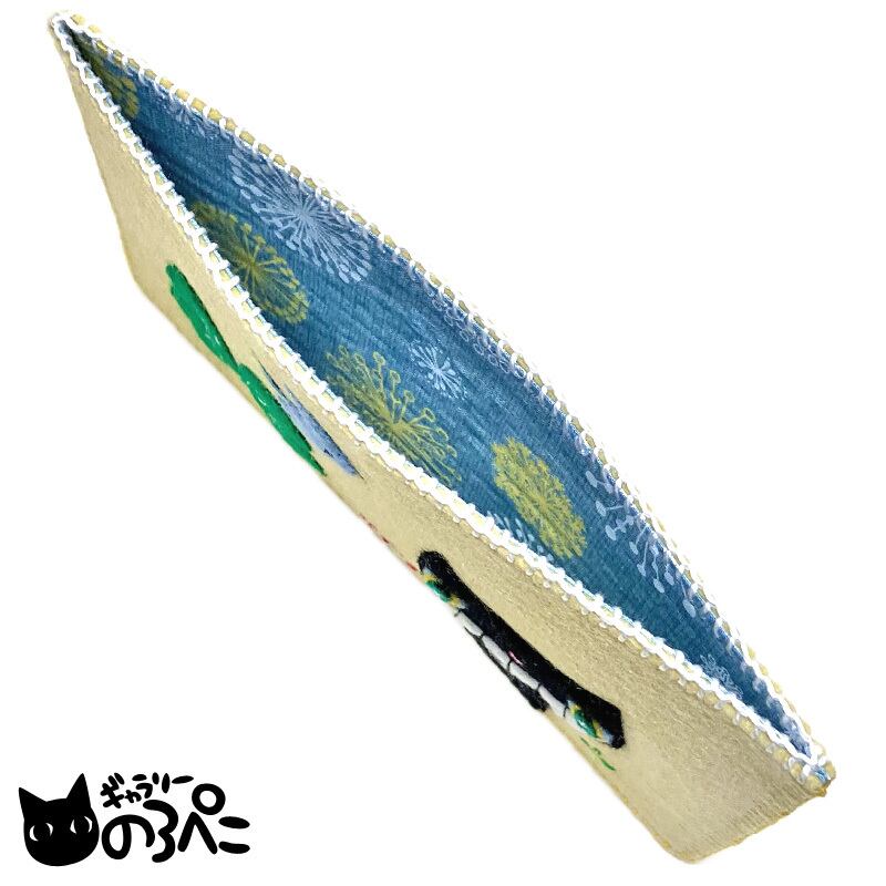 黒猫のイシシ君と青い鳥のぺたんこ通帳ケース(からし色フェルトの開放型フラットケース) D4029-719