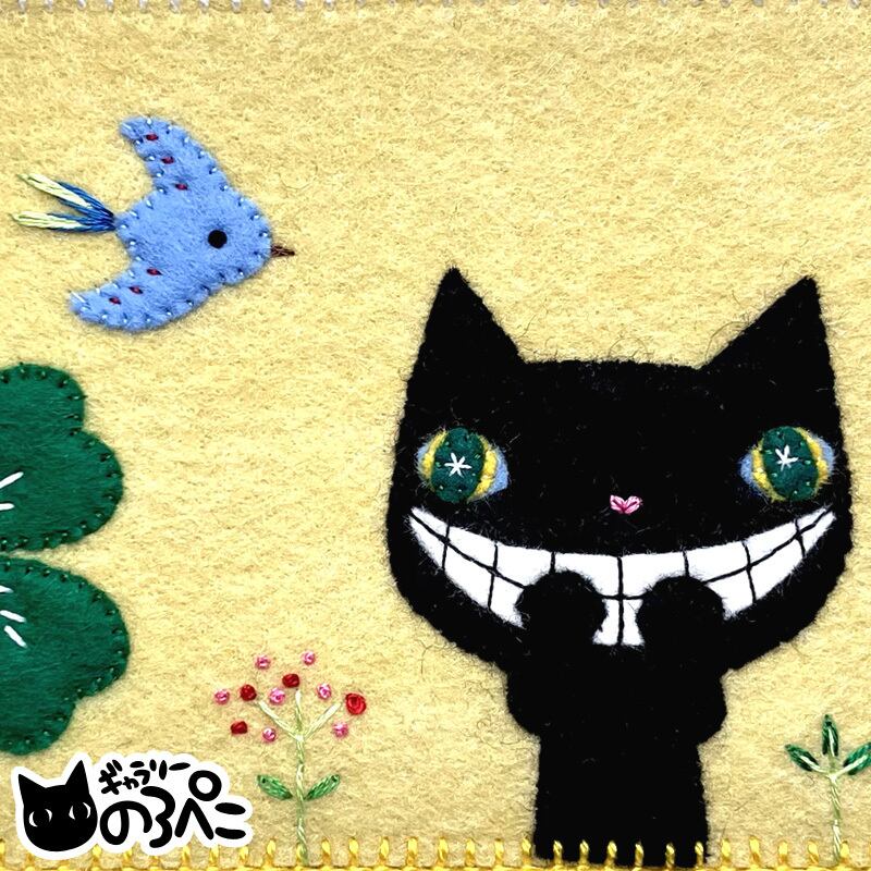 黒猫のイシシ君や青い鳥さん、四つ葉のクローバーはフェルトアップリケの手法で、イシシ君の表情やお花などは細やかな手刺繍で描かれています。もともと絵本をつくったりされていた作家さんがつくられているだけに、イメージ豊かな世界観で、見ているとなんだかストーリーまで伝わってくるようです。