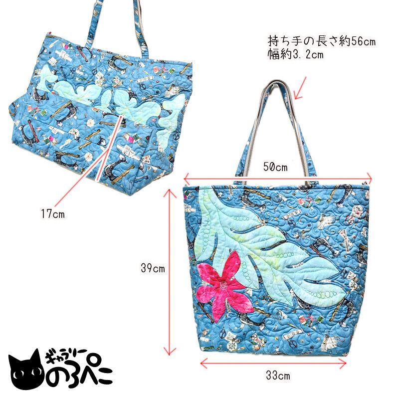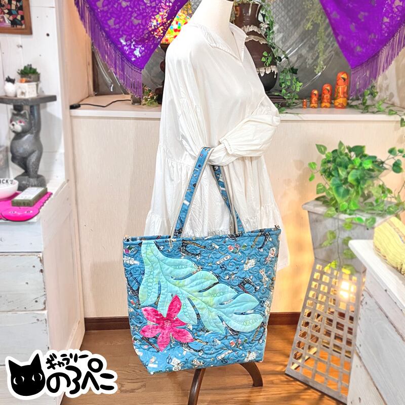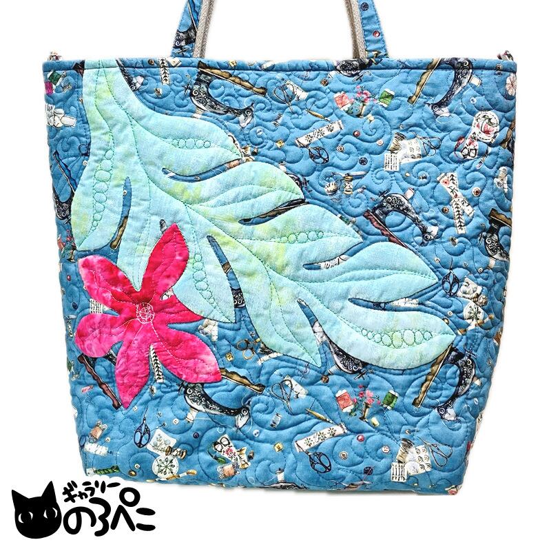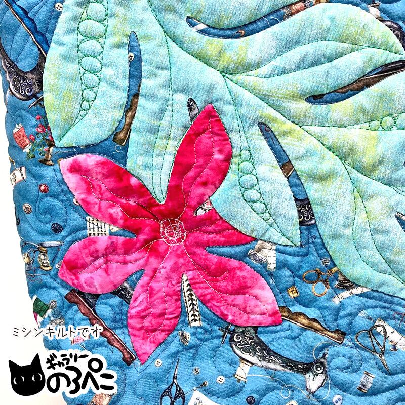 葉っぱや花びらのディテールやまわり一面に描かれた模様は、フリーモーションキルティングで描かれています。くるくるした模様は、波のような、草花を揺らす風のような・・。南の島を思わせるような雰囲気と、ミシンなど裁縫道具が散りばめられたUSAコットンの楽しさで、なんだか手にしていると心がうきうきしてきてしまいます。