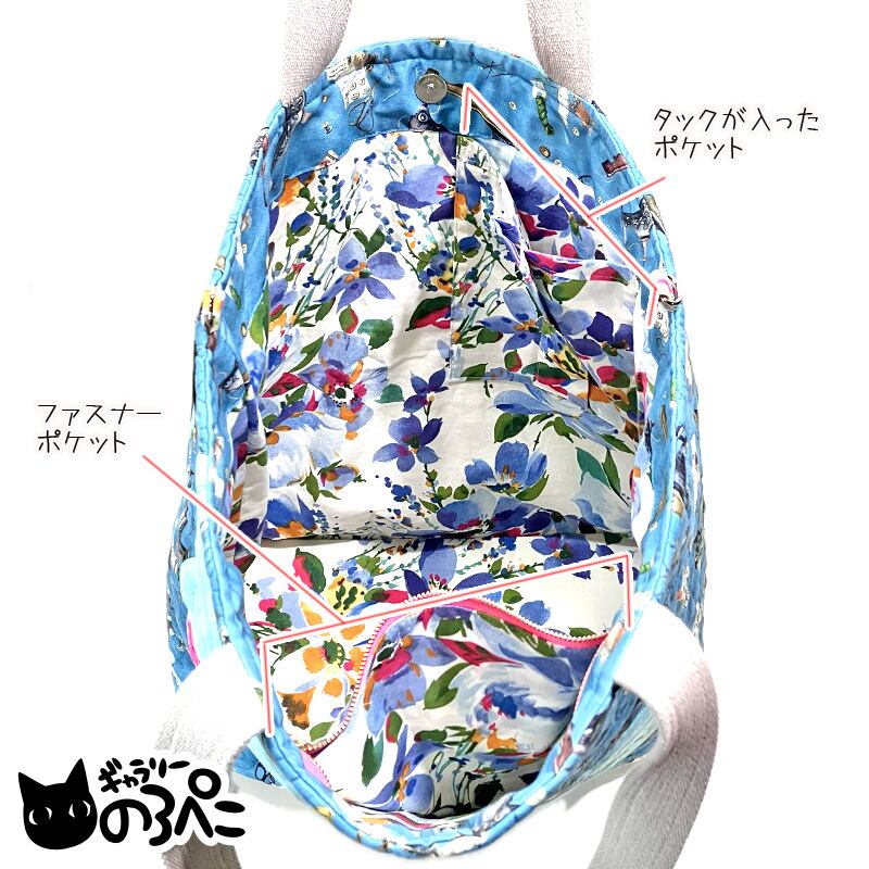 内側は、異国の雰囲気漂うシックな花柄USAコットン。ファスナーポケットと、逆側にもうひとつスマホなどをストンと入れられるくらいのタック付きポケットが付けてあります。