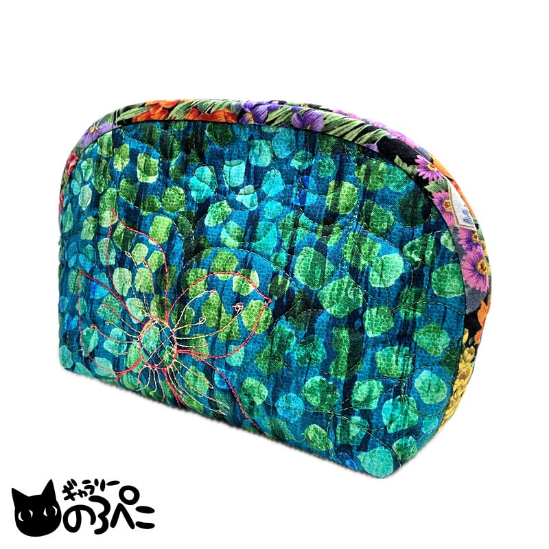 プルメリアのフリーモーションキルトポーチ(グリーンのUSAコットンにプルメリアをフリーモーションで描いた大きめポーチ) bc843-118