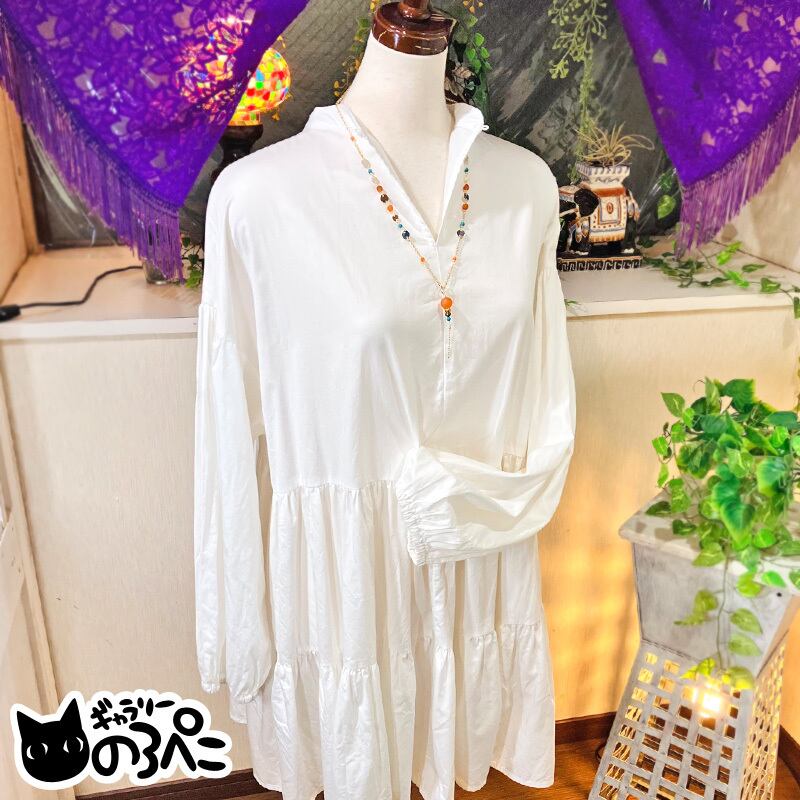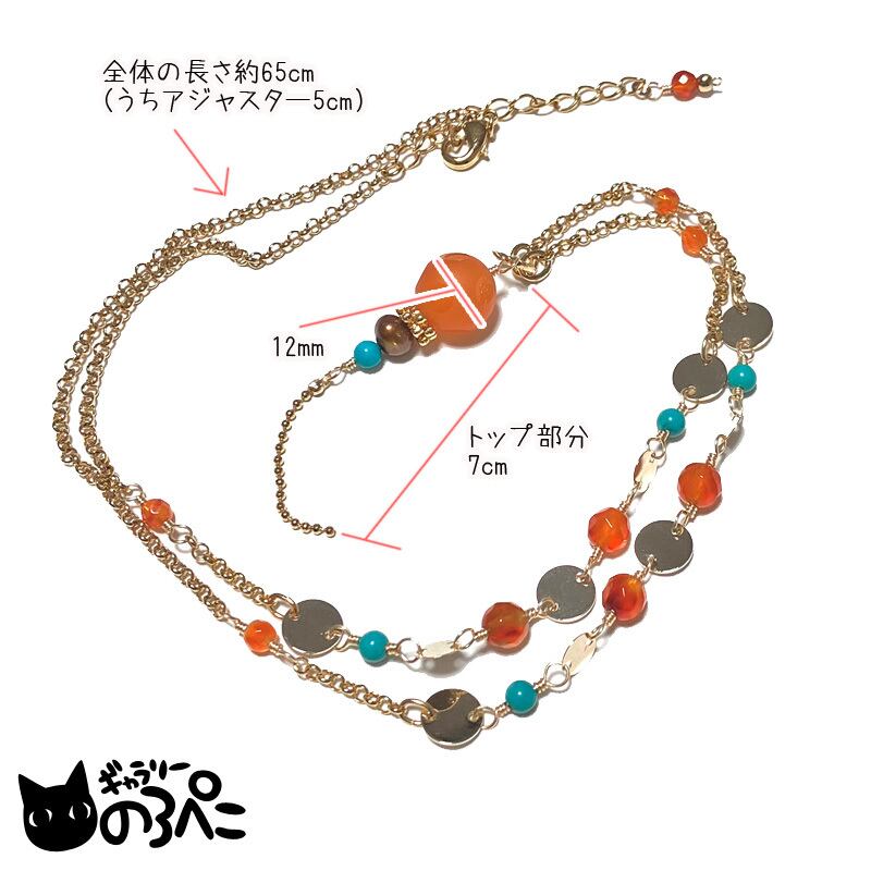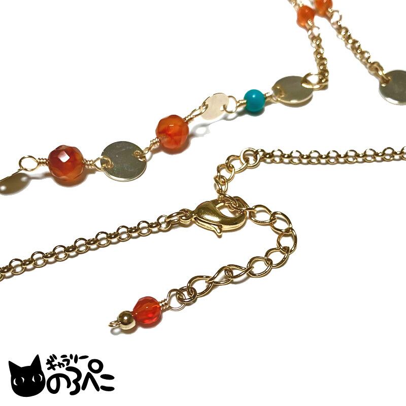 ネック部分にも同じくカーネリアンとグリーンターコイズを使って、アクセントに大きさの違うメタルプレートを挟んでいます。