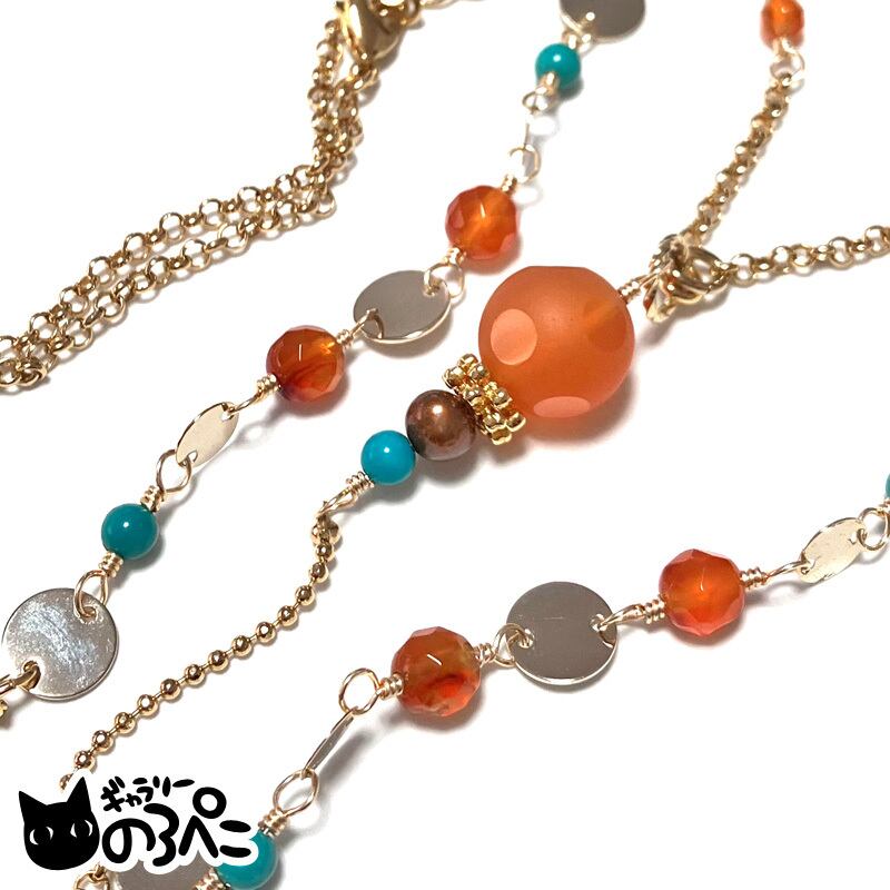 トップモチーフはフロスト加工に水玉カットが施されたころんと大きなカーネリアンに、ブロンズ色の淡水パールとグリーンターコイズをカットボールチェーンと繋ぎました。