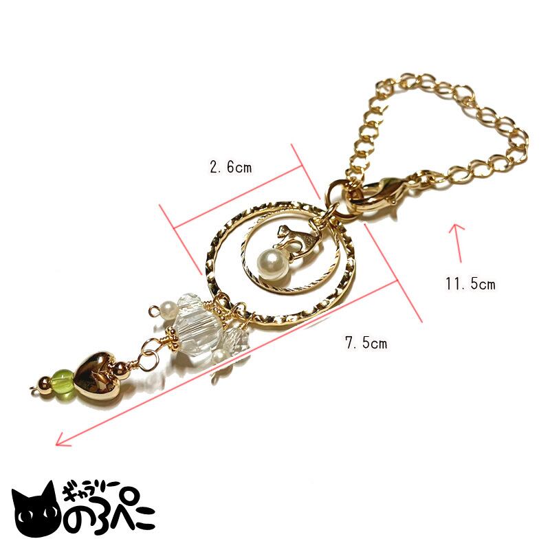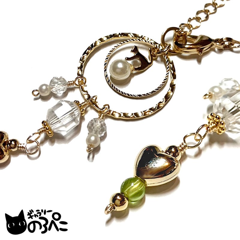 天然石(水晶・ペリドット)、猫チャーム、樹脂パール、メタルリング(28mm)、樹脂ハートビーズ、メタルビーズ、ヒキモノリング(17mm)、カニカン、ワイヤー、チェーン
