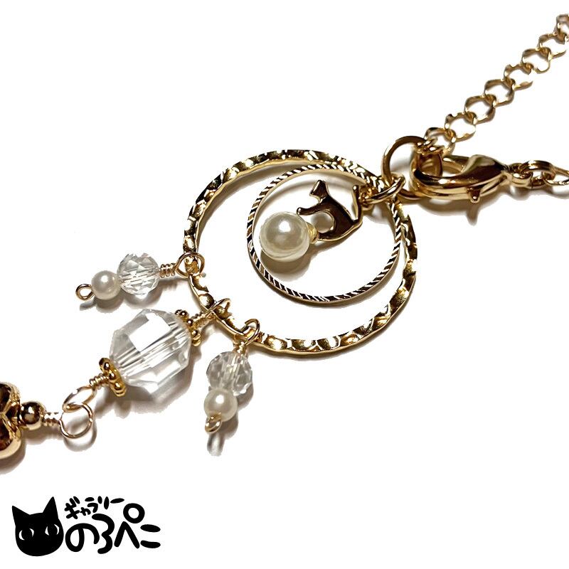 メタルリングの中で、パールビーズで玉乗りをしているネコのチャームがゆらゆら・・・。