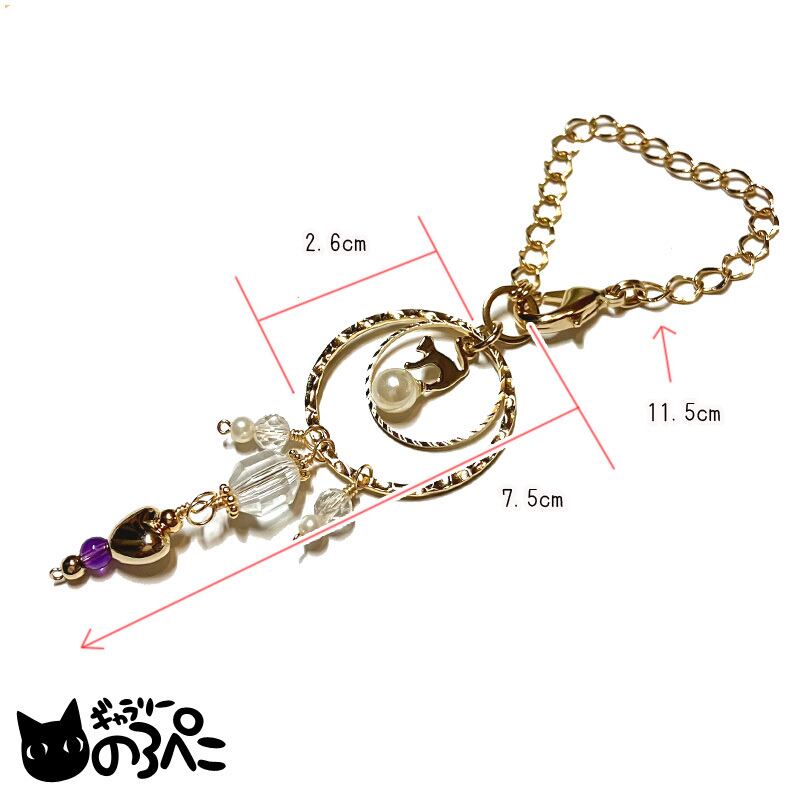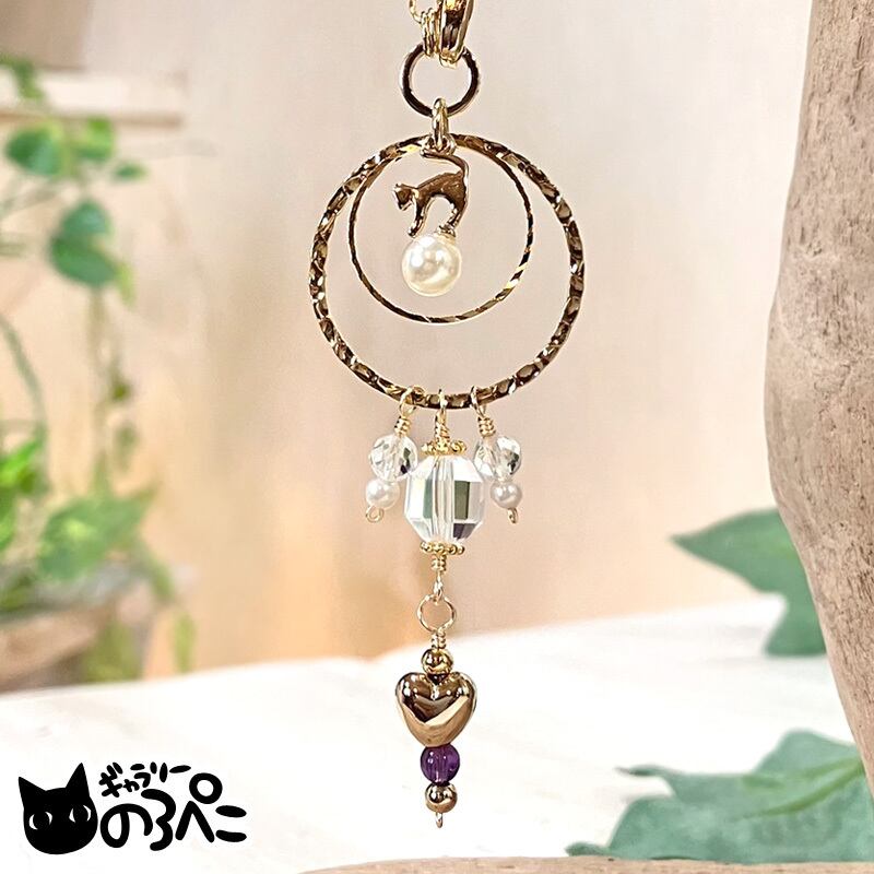 天然石(水晶・アメジスト)、猫チャーム、樹脂パール、メタルリング(28mm)、樹脂ハートビーズ、メタルビーズ、ヒキモノリング(17mm)、カニカン、ワイヤー、チェーン