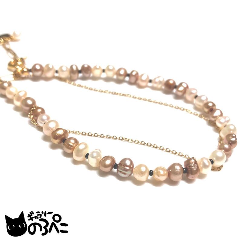 小さな粒たちですが、一粒一粒に表情があってとても可愛らしいです。ベージュ系のものを繋ぎながらリズミカルに濃淡を散りばめ極細ゴールドチェーンとあわせたデザインは、エレガントな落ち着きを見せながらもなにか楽しそうにきらめいて、可憐に心をくすぐります。