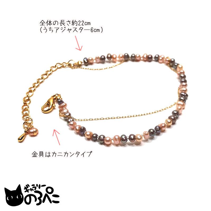淡水パールの幅約0.2~0.3cm(2~3mm)程度 / ブレスレットの長さ約22cm(うちアジャスター約6cm) / 金具はゴールドカラーです