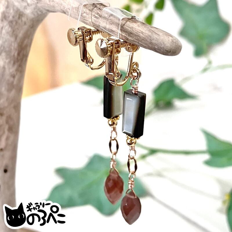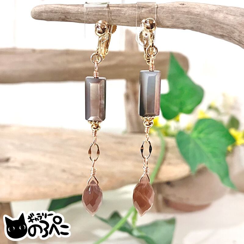 ブラックシェルとチョコレートムーンストーンのイヤリング(シラー輝く宝石質チョコレートムーンストーンの天然石イヤリング) aa458-815