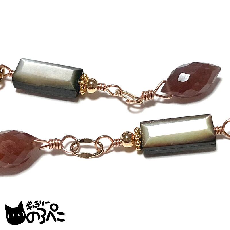 ブラックシェルにはシェル特有の照りが、チョコレートムーンストーンには石の表面に滑らかなシラーが浮かび、カット面がキラキラと輝きます。