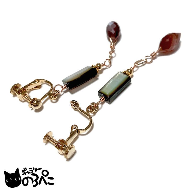 天然石(チョコレートムーンストーン)、ブラックシェル、ワイヤー、チェーンコマ、メタルパーツ(デイジー)、メタルビーズ、ネジバネ式イヤリング金具