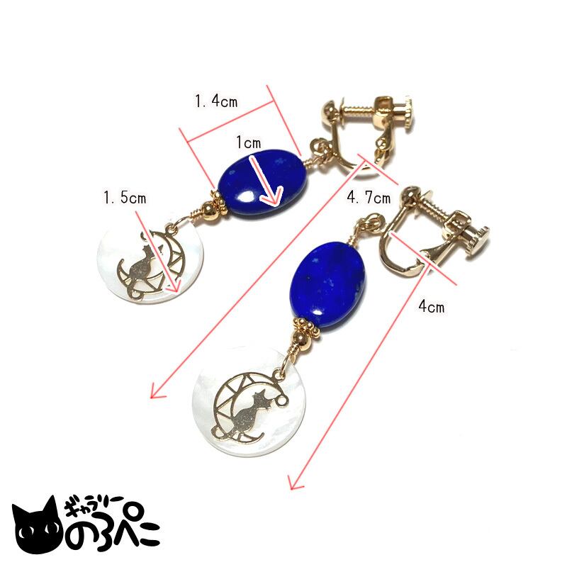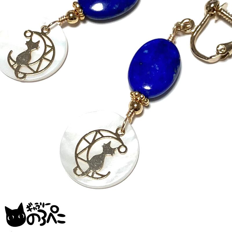 ラピスラズリと月猫のイヤリング(夜空のようなラピスラズリと猫と月光のホワイトシェルの天然石イヤリング) aa458-819