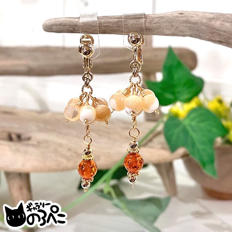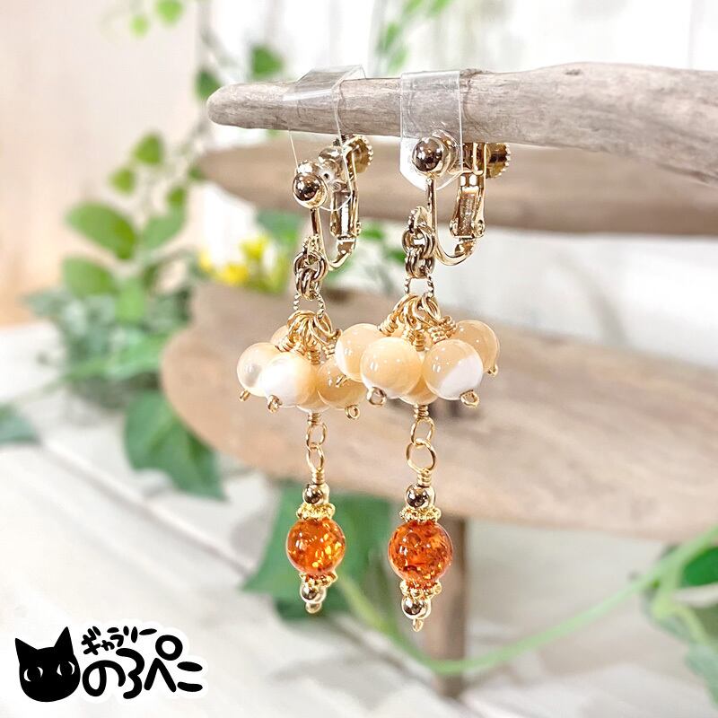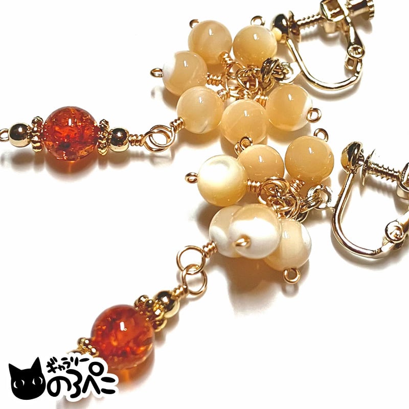 天然石(バルティックアンバー)、マザーオブパール、メタルビーズ、アーティスティックワイヤー、ネジバネ式イヤリング金具