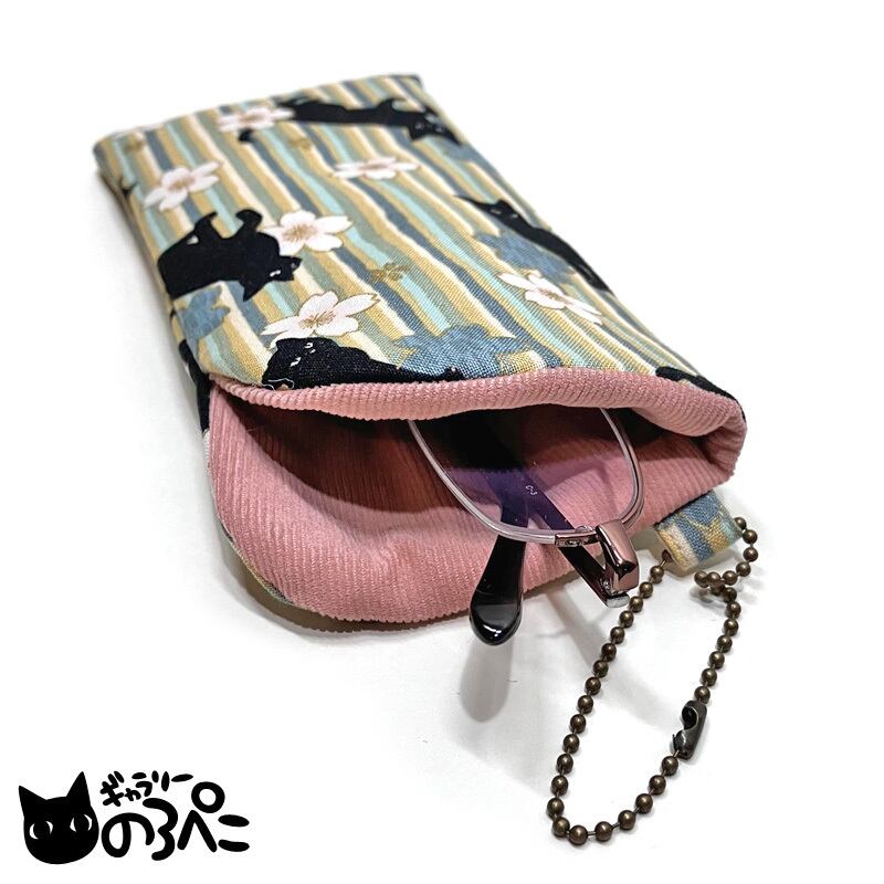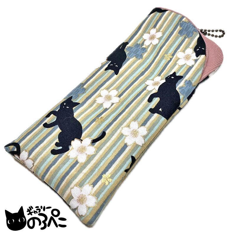桜と黒猫ちゃんのふんわりメガネケース(ふかっとした使い心地の猫と桜と縦縞模様の和柄ソフトメガネケース・枯れ緑系ストライプ) bc816-999