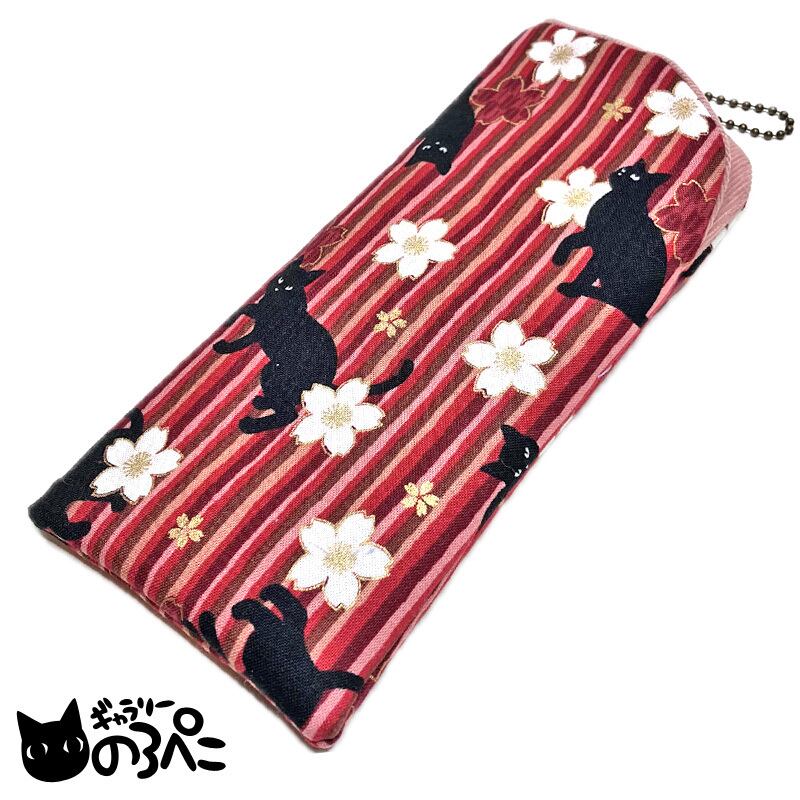 桜と黒猫ちゃんのふんわりメガネケース(ふかっとした使い心地の猫と桜と縦縞模様の和柄ソフトメガネケース・暗赤系ストライプ) bc816-1000