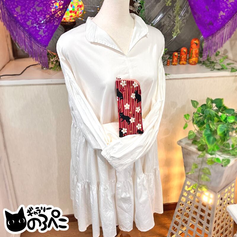 桜の花を見上げる黒猫ちゃんがとても可愛らしいです。でも、シックな色合いなのでとても落ち着いた雰囲気。入れ口のところから内布のスモーキーピンクがチラリと見えるのがなんだか着物みたいで素敵です。
