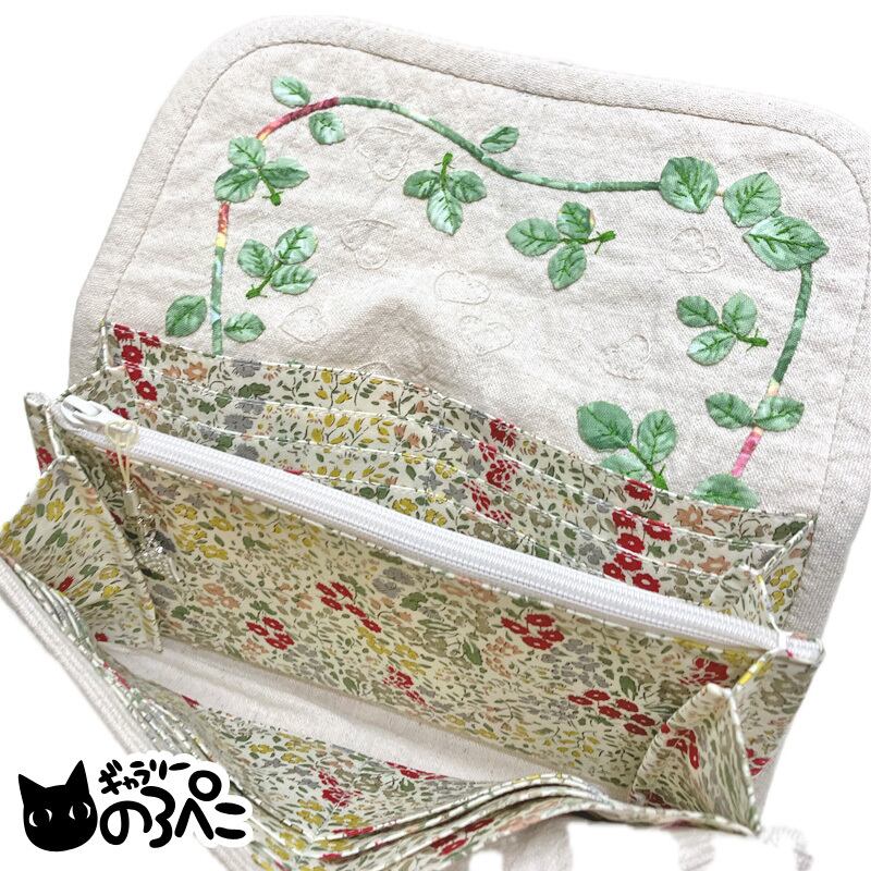 この細いラインもすべて細やかなアップリケで表現されています。葉には葉脈の手刺繍、ハートキルティングは内側にメタリックスレッド糸でステッチが入れてあります。