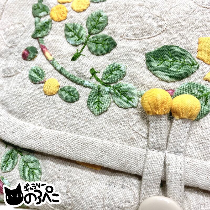 本体は生成りのコットンリネン生地。程よく厚さもある丈夫な生地で、接着芯も使ってあるので、程よい張りがあってしっかりしています。生地は少しシボ感のある自然な風合い。清浄感のある明るめの生成り地に、薔薇の花の黄色や葉や茎の緑色が美しく映えます。