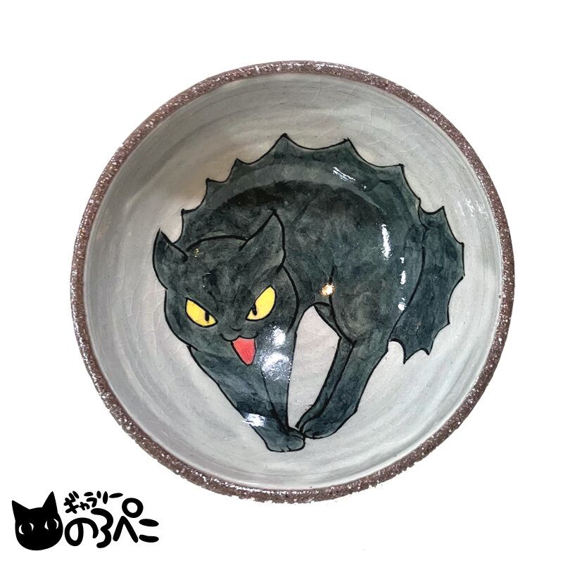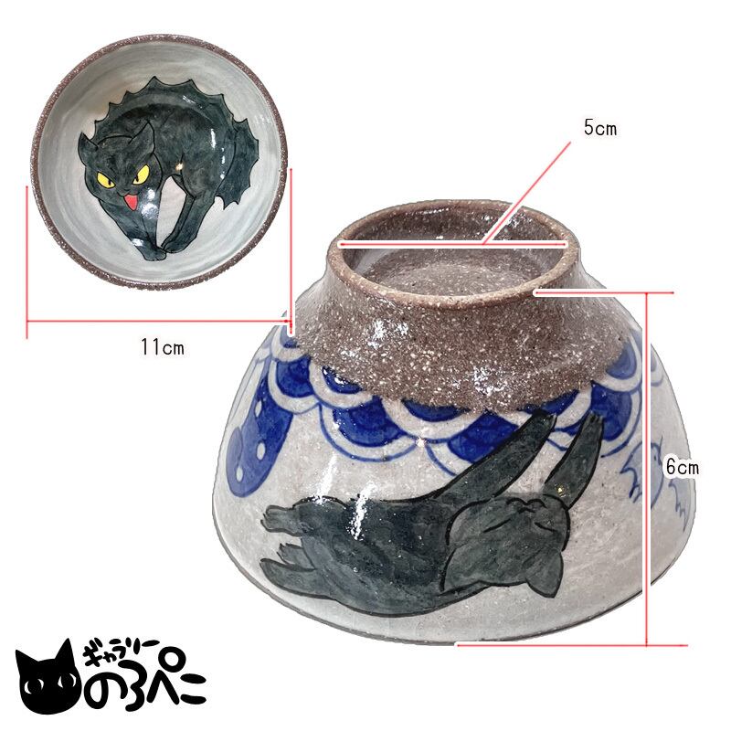 内側では、黒猫ちゃんがハーッてなってますが・・この表情はたぶん遊んでほしいのかな?(笑) 見込みの曲面に描かれているので、背中をふくらませた感じ、躍動感いっぱいです。ごはん食べ終わったら猫ちゃんが出てくるので、なんだかごちそうさまのたびに思わず笑顔になってしまいそうです♪