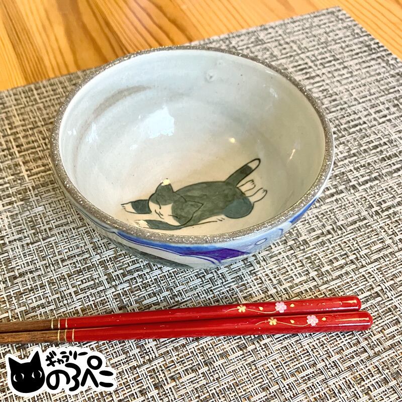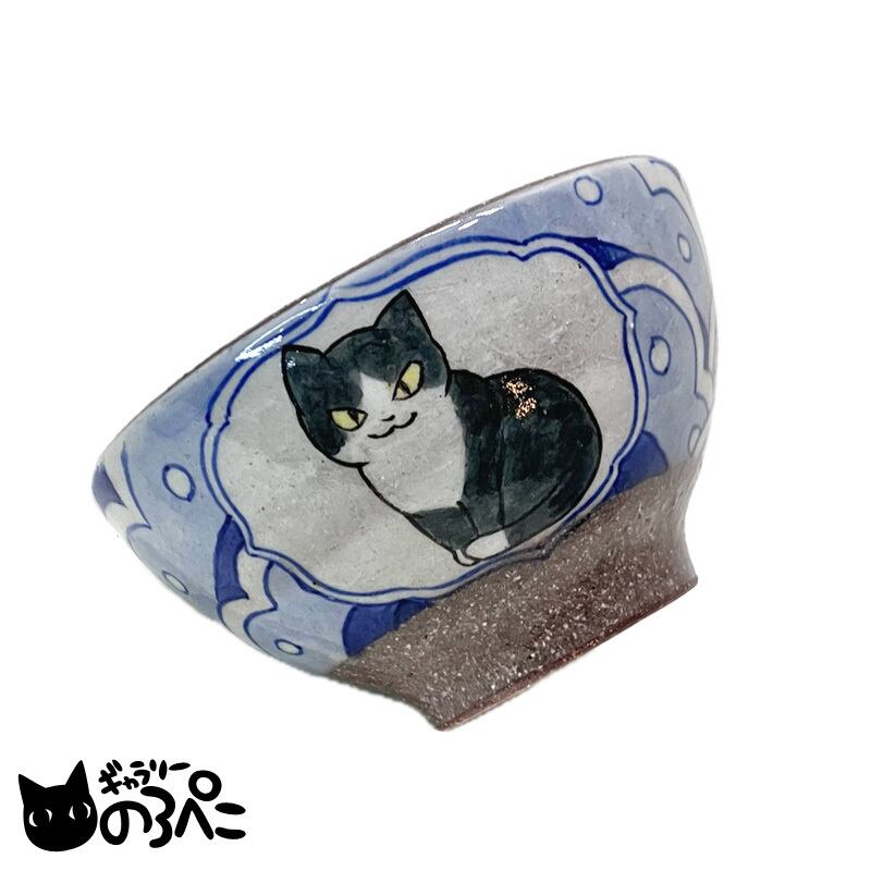 久峰窯 猫絵のお茶碗・中(波模様とはちわれ猫ちゃんの外絵とうれしそうに駆けるはちわれ猫ちゃんの内絵のお茶碗・4寸サイズ) bc808-147