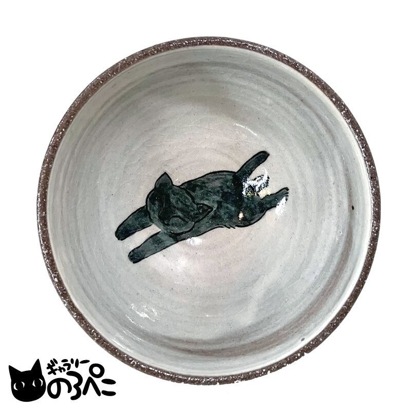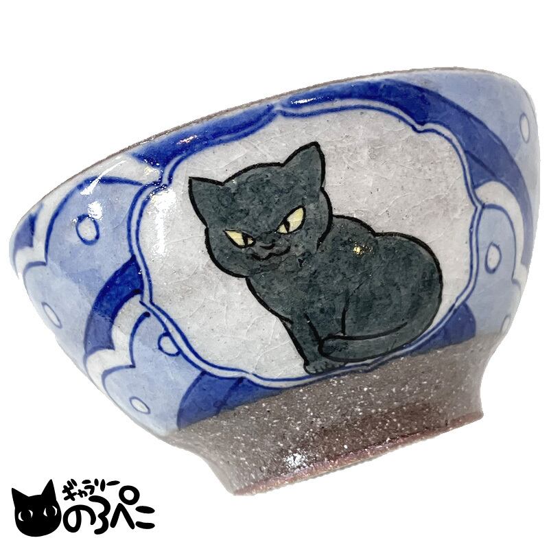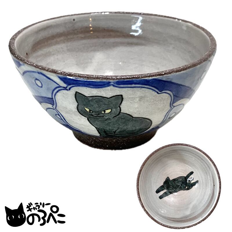 久峰窯 猫絵のお茶碗・大(波模様と黒猫ちゃんの外絵とうれしそうに駆ける黒猫ちゃんの内絵のお茶碗・4.2寸サイズ) bc808-151