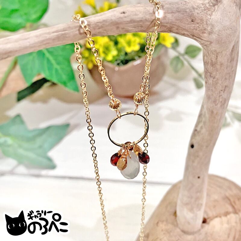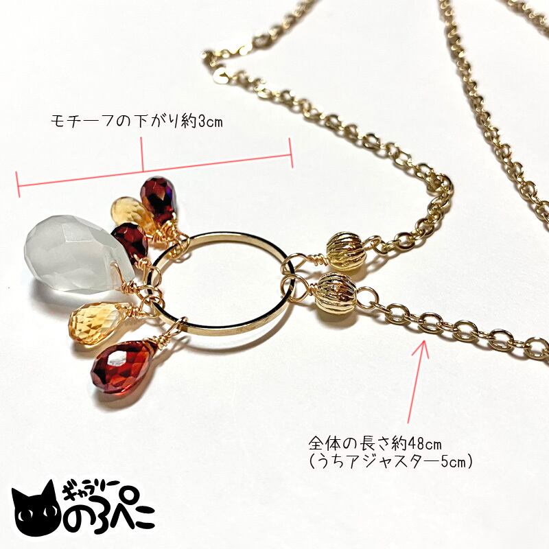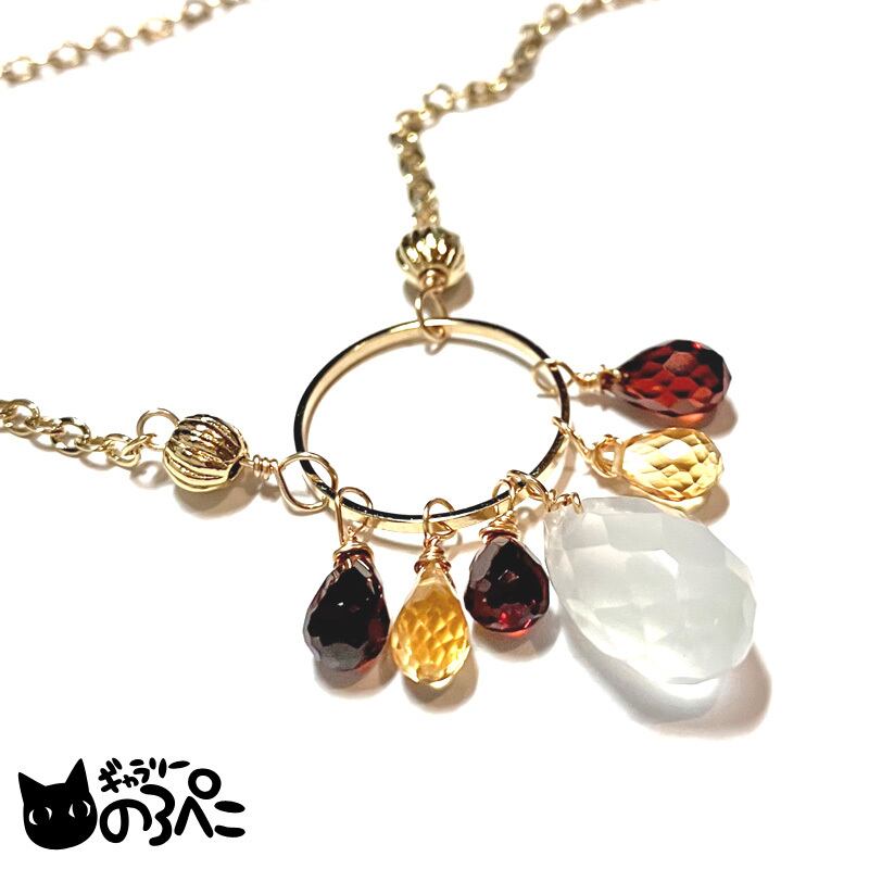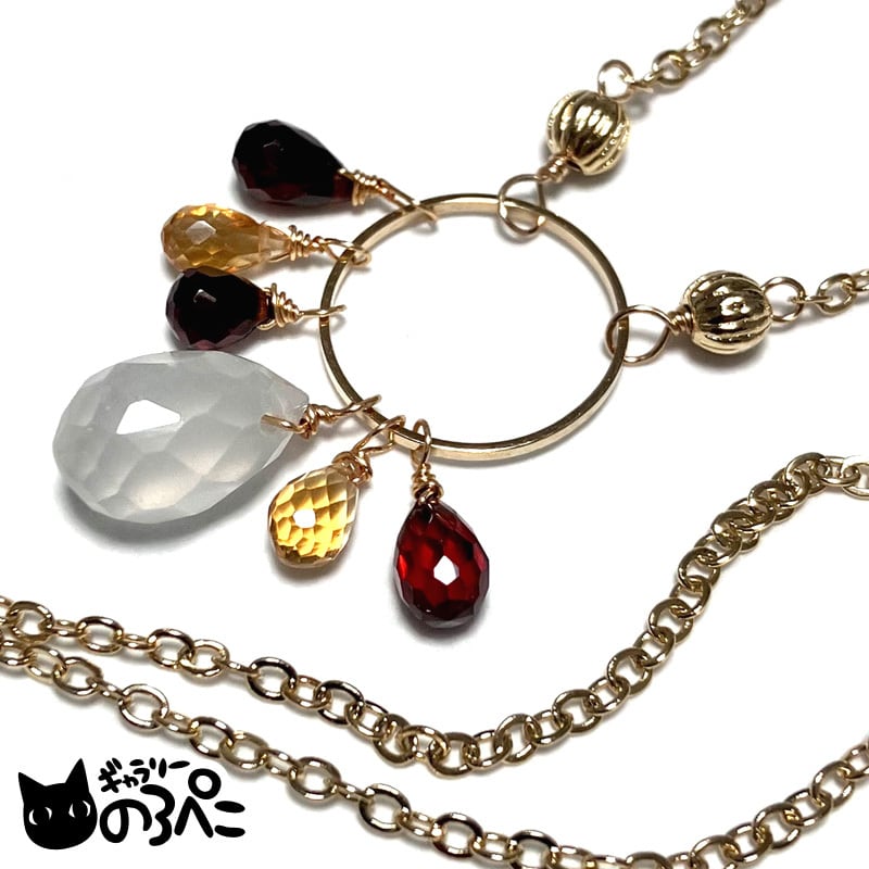 フローライトの柔らかい乳白色と、ガーネットの強い赤色とシトリンの黄色のコントラストが楽しいネックレスです。