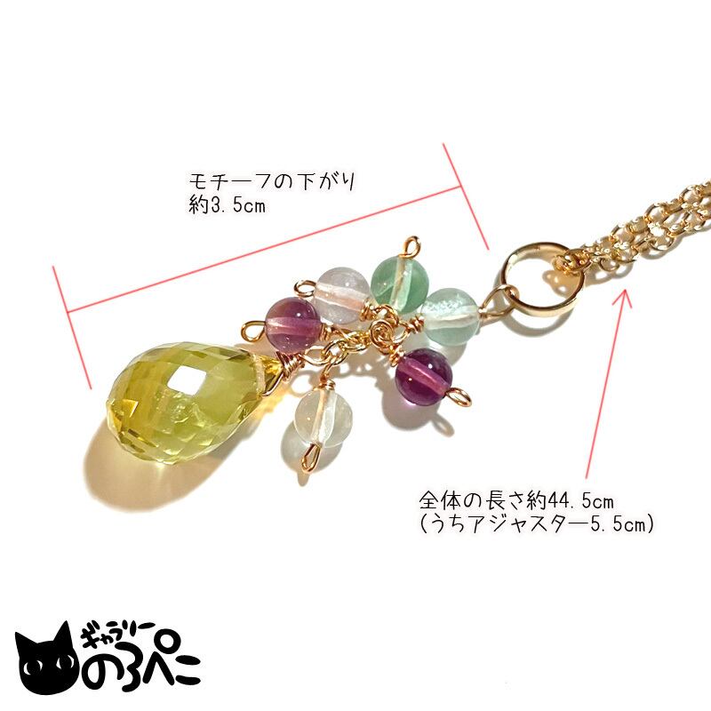 モチーフの下がり約3.5cm / レモンクォーツは直径約0.8cm×長さ約1.2cm / ネックレスの長さ約44.5cm(うちアジャスター約5.5cm) / 金具はゴールドカラーです