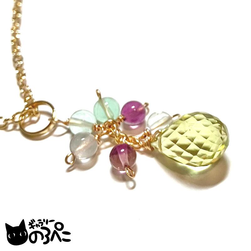 レモンクォーツとフローライトのドロップネックレス(レモンクォーツ&フローライトのフリンジ天然石ネックレス) bc798-111