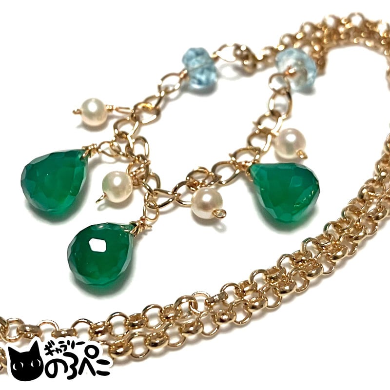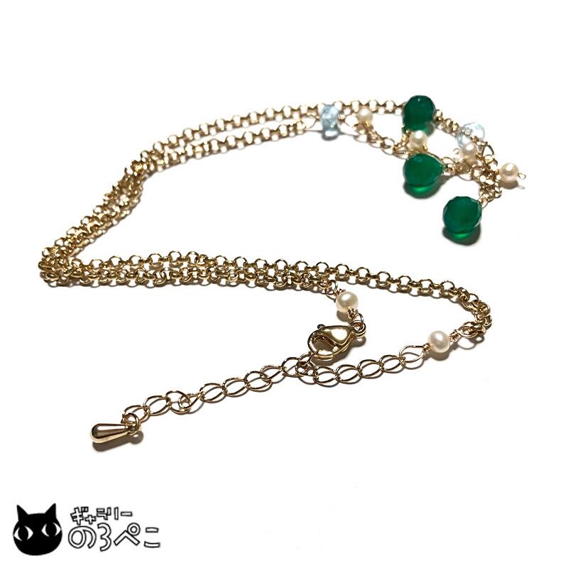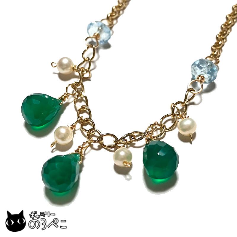 天然石(グリーンオニキス・ブルートパーズ)、淡水パール、チェーン、カニカン、アーティスティックワイヤー、アジャスター(5cm)