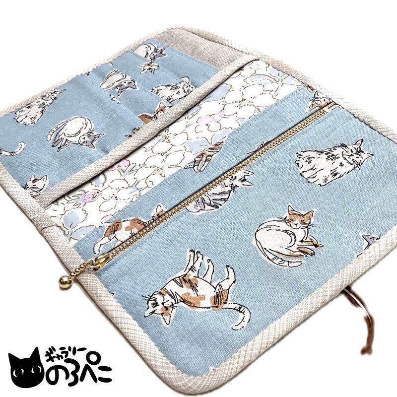 外側のコットンリネンキャンバス生地は褪せ感のある自然な薄水色。手描き調の猫ちゃんたちはのんびりリラックスした雰囲気で、なんだか見ていると心が和みます。