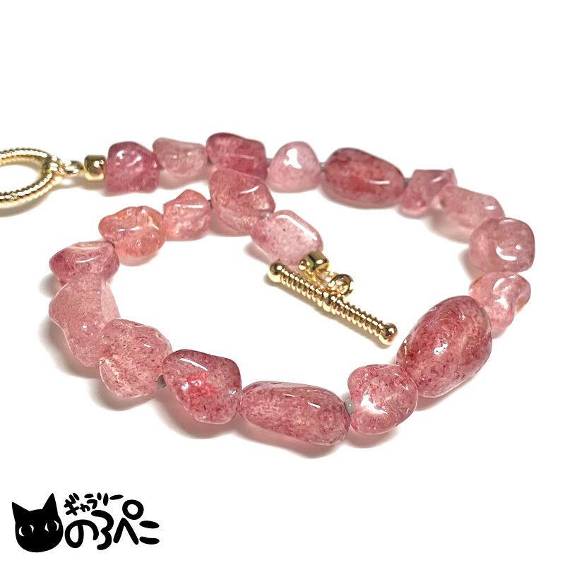 ストロベリークォーツのあいだに小さな小さなグレーのチェコビーズをさりげなく入れてあることで、可愛らしさの中にも落ち着きを感じる上品で奥行きある魅力が生まれています。