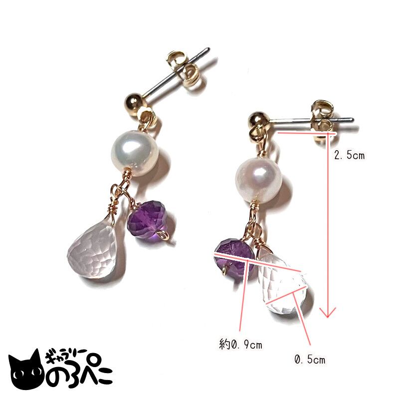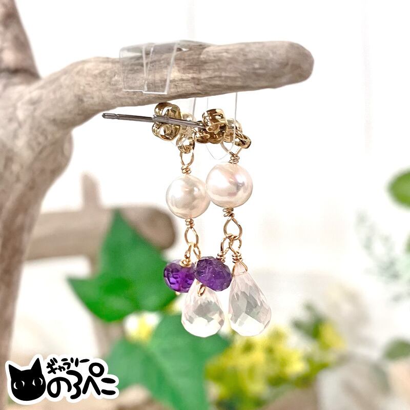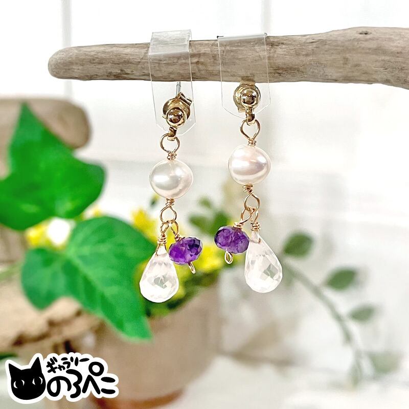 ローズクォーツとアメジストと淡水パールのピアス(ローズクォーツのしずくとアメジストがきらめく天然石ピアス) bc798-110