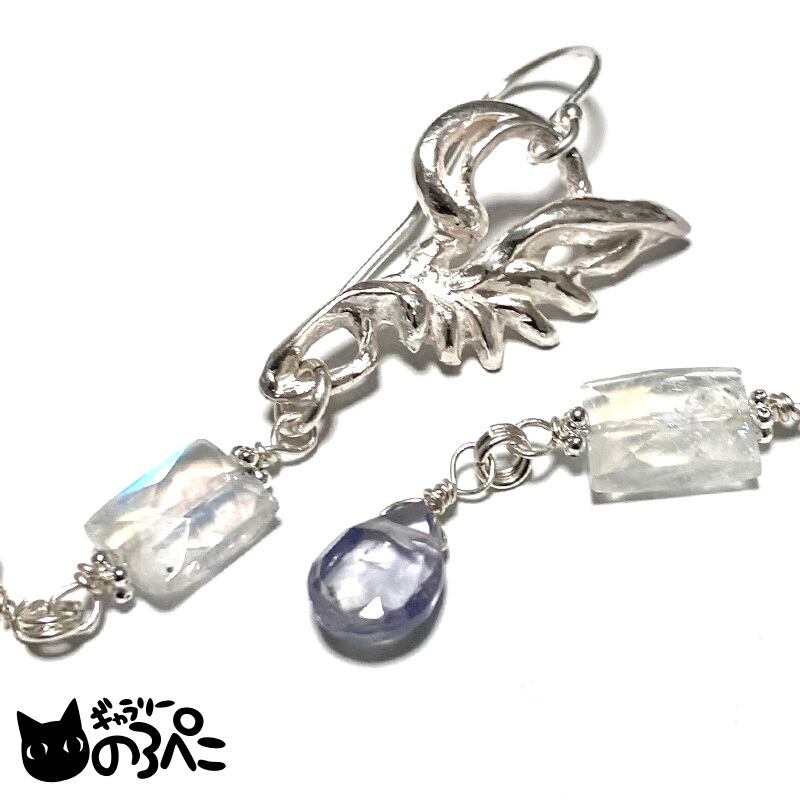 「感受性を高める」意味を持つブルームーンストーンと、「正しい方向への前進」を促すとされる淡い色味のアイオライトを組み合わせました。純銀の羽モチーフは「運気の上昇」を表しています。