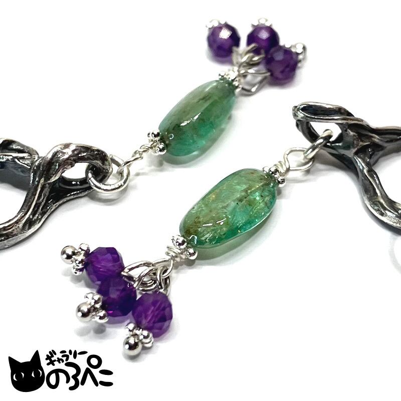 エメラルドとアメジストのシルバーピアス(水流の純銀モチーフとsv925のピアス) bc823-126