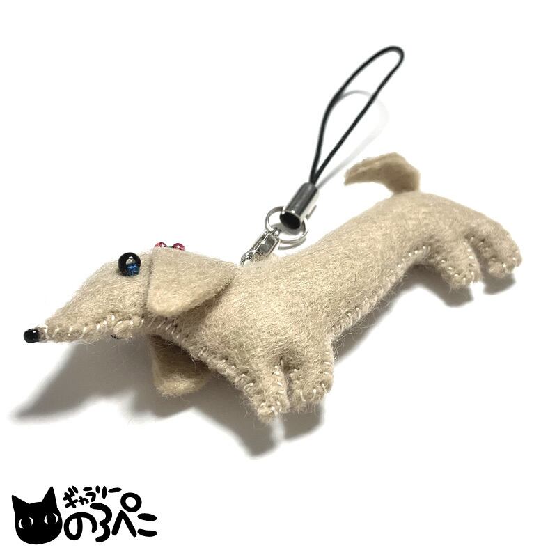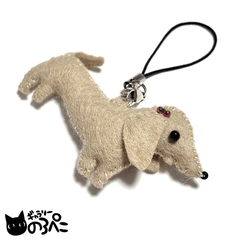 ダックスのストラップ(耳飾りをしたクリーム色ダックスのフェルトマスコットストラップ) D4029-697