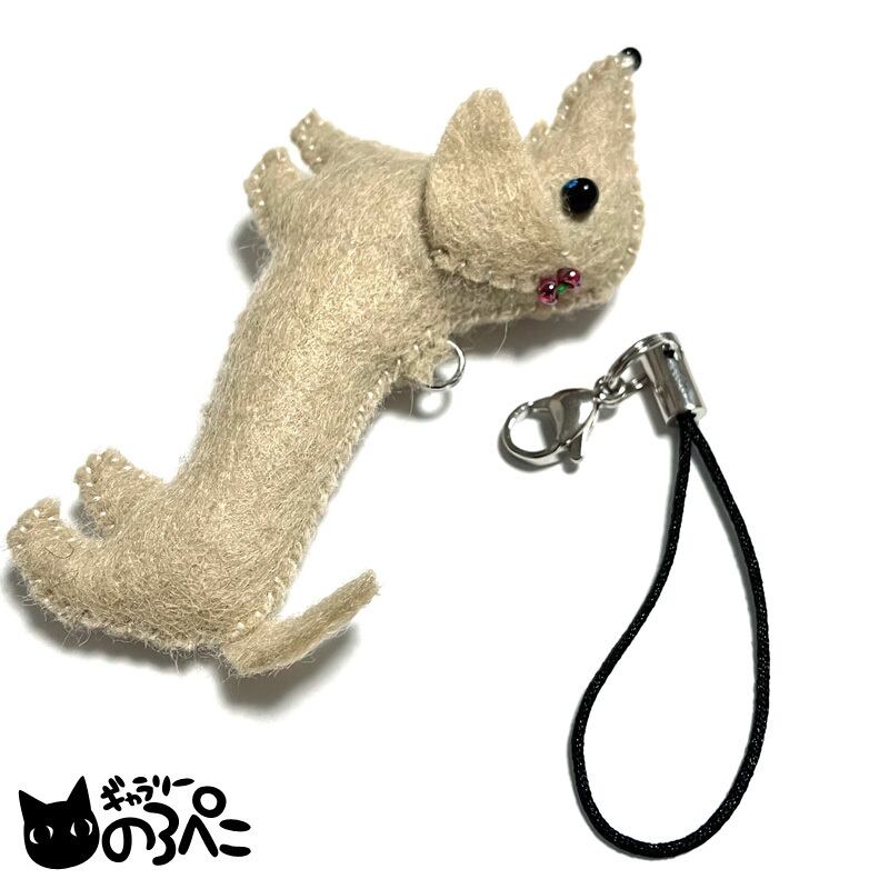 厚さのあるフェルトを使って、アップリケの手法でつくられたかわいらしいサイズのマスコットストラップです。中綿を入れてあるので、ふっくらしていて立体感があります。