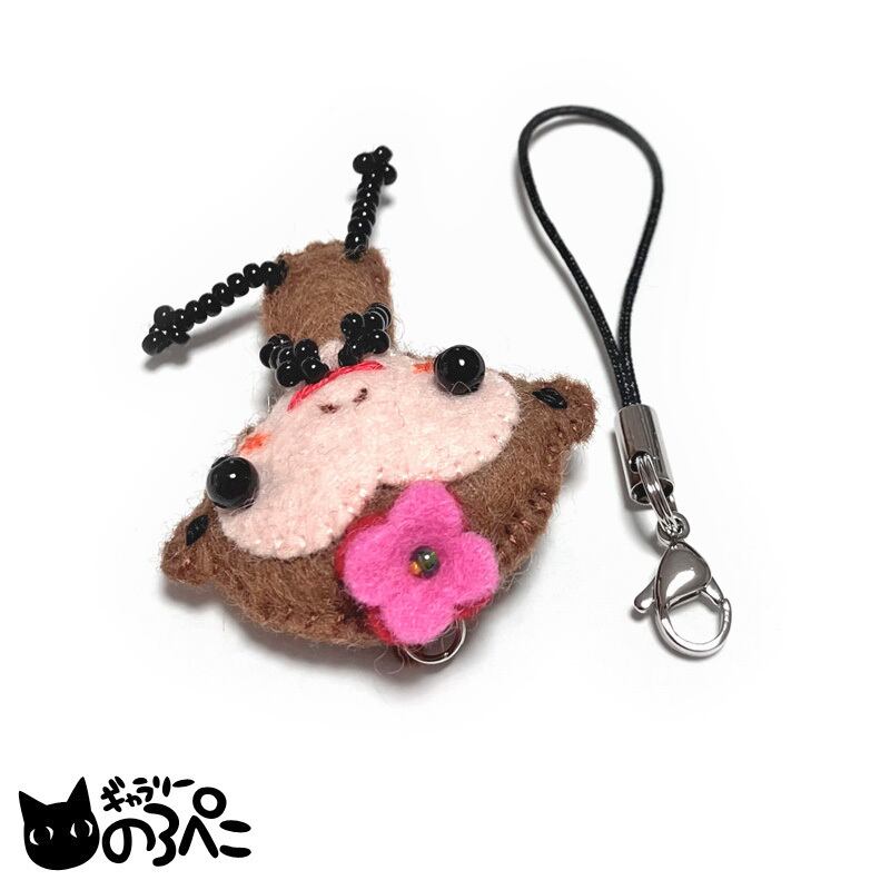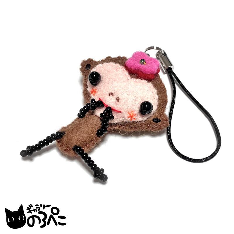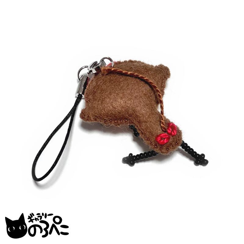厚さのあるフェルトを使って、アップリケの手法でつくられたかわいらしいサイズのマスコットストラップです。中綿を入れてあるので、ふっくらしていて立体感があります。手足はビーズ、表情は細やかな手刺繍で描かれています。