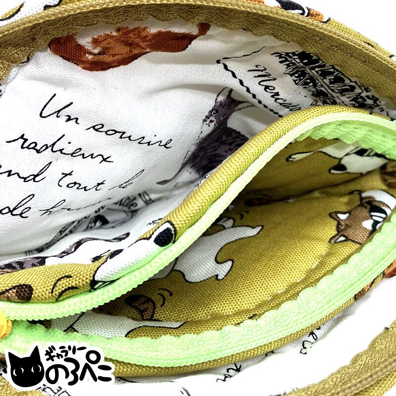 内側はパリの猫ちゃん柄のコットン生地。こちらはふつうの厚みの生地なのでポーチ内はやさしい手触りです。キルト芯に厚みとクッション性があるので、中身を守ってくれる安心感があります。