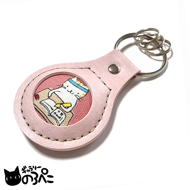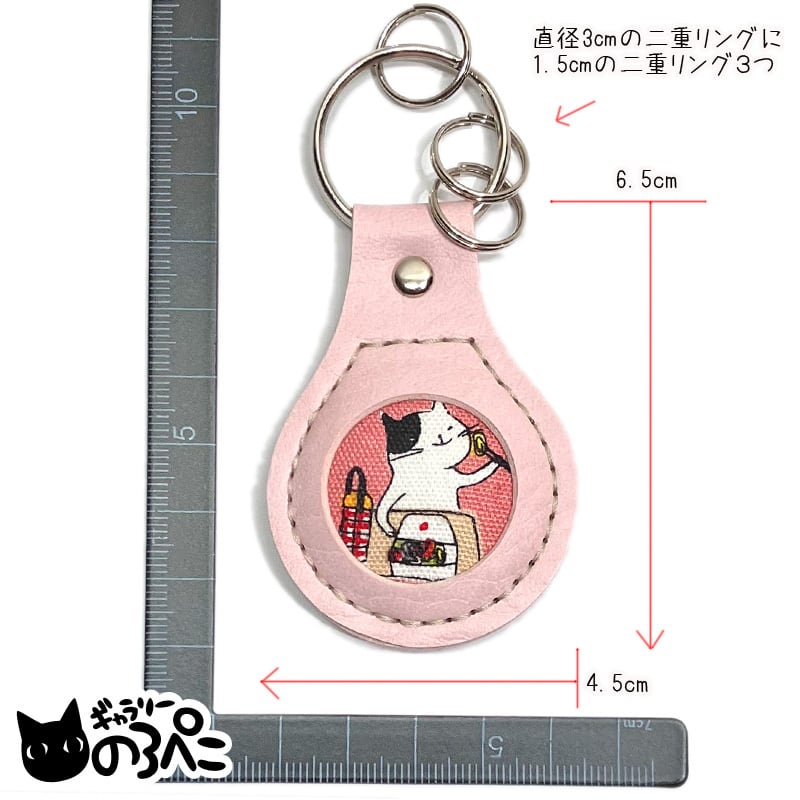 学校猫ちゃん勉強&お弁当のレザー調キーホルダー(円窓から猫柄生地がのぞくキーリング3つ付きキーホルダー・スモークピンク) aa362-a471