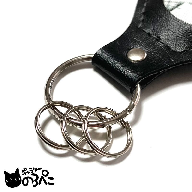 3cmのダブルリングに、1.5cmのキーリングを3つつけています。リングは取り外し可能なので、はずしてバッグチャームとしてお使いいただいてもかわいいと思います。