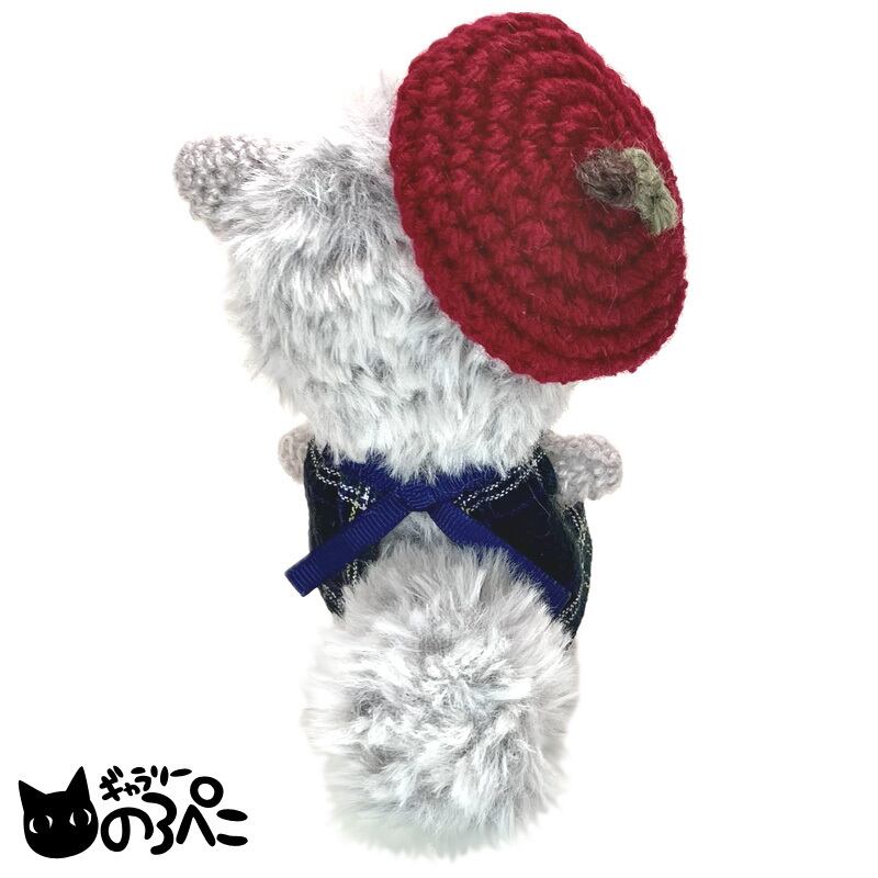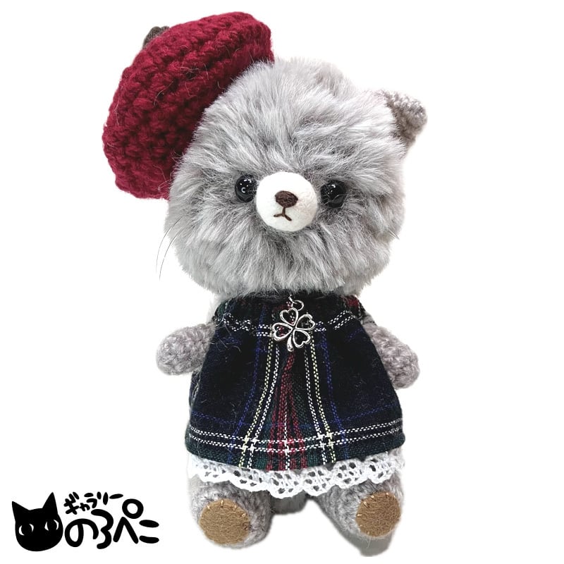 お顔とからだ、しっぽはふわふわの毛糸、お耳、手足はモヘア糸で編んでいます。お洋服、ベレー帽も手作りしています。ベレー帽は取り外し可能ですが、お洋服は後ろでリボンを縫い留めてありますので着脱できません。