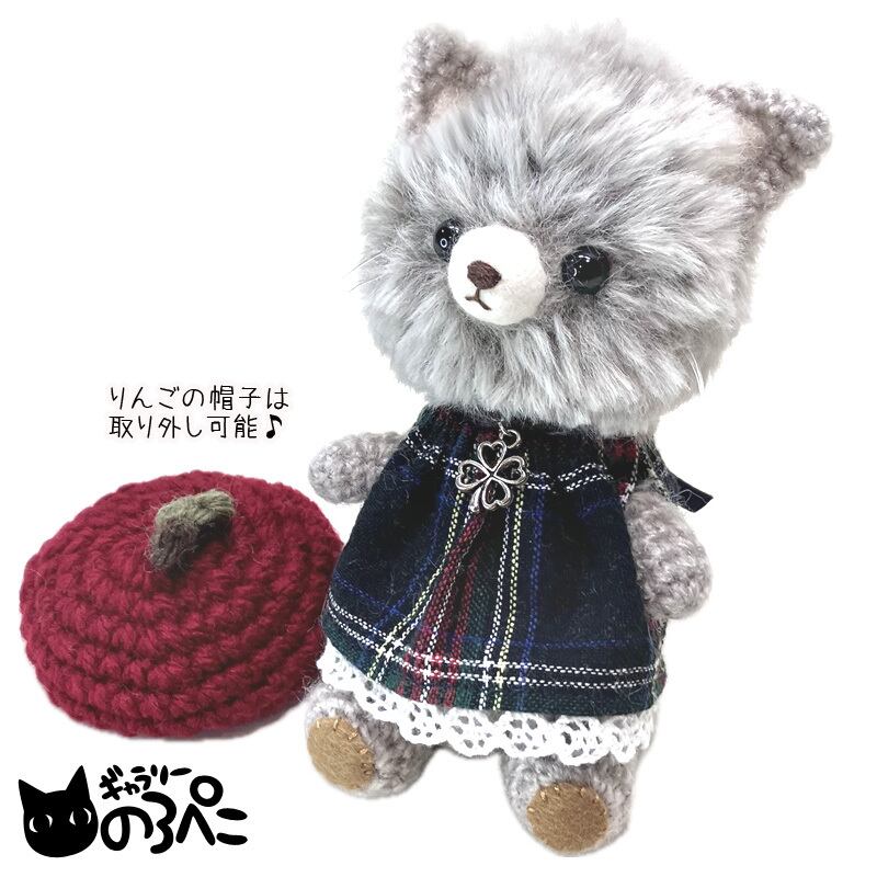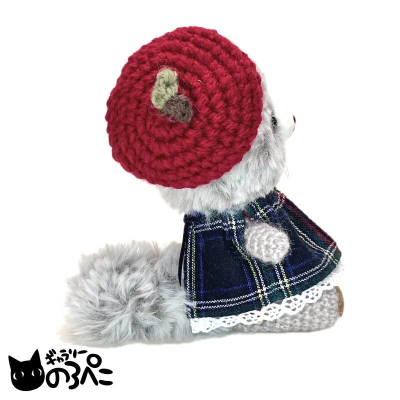 赤いりんごのベレー帽のグレージュ猫ちゃん(タータンチェックワンピースのふわふわ毛糸のあみぐるみ猫ちゃん) bc854-38