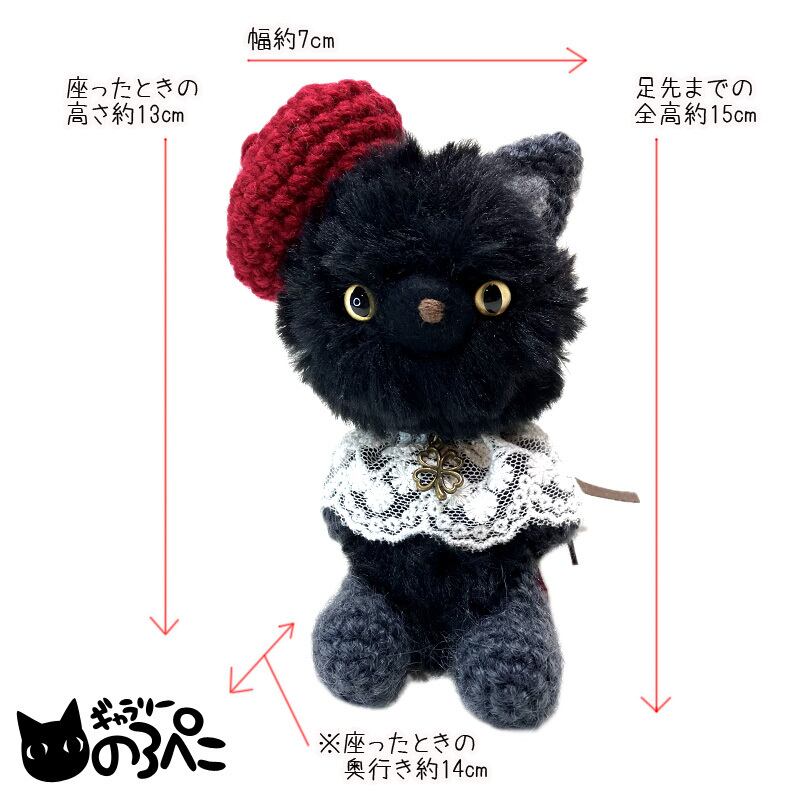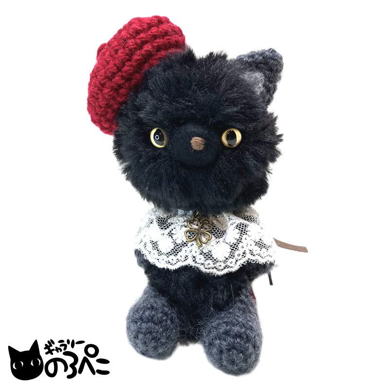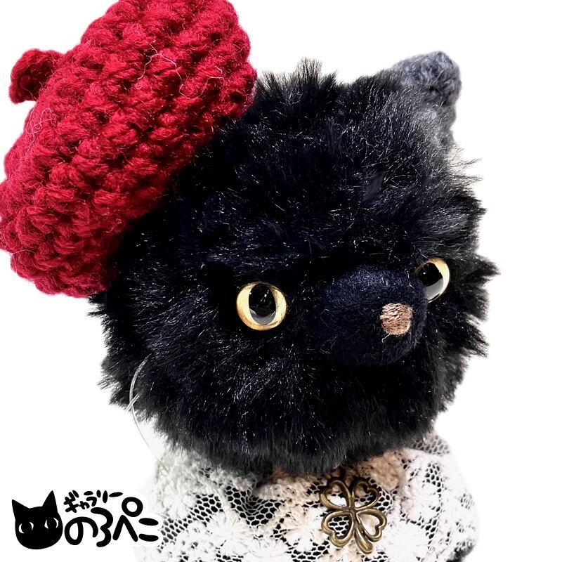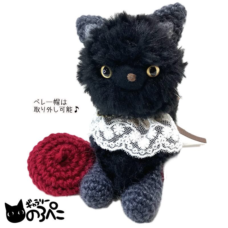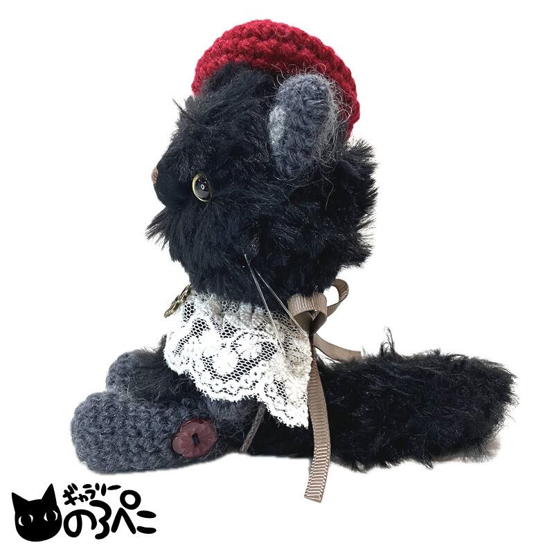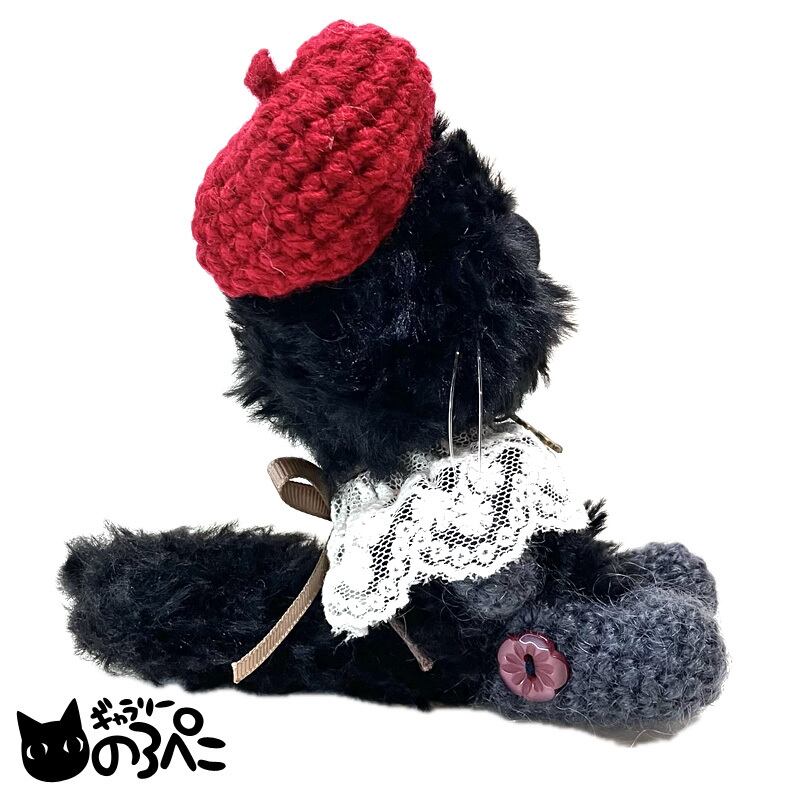 ベレー帽とレースの付け襟でおしゃれした黒猫ちゃん(ふわふわ毛糸とモヘア糸のあみぐるみ) bc854-34