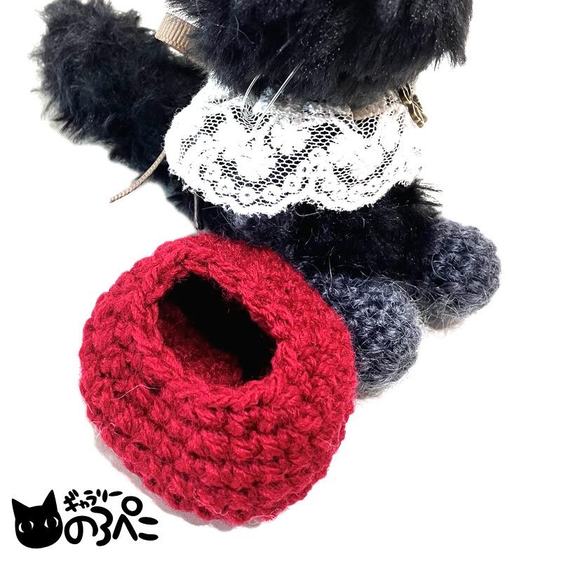 お顔とからだ、しっぽは毛足の長いふわふわの毛糸を使用しています。お耳、手足はモヘア糸で編んでいます。ベレー帽は取り外し可能です。レースの付け襟はリボンを通し後ろで結び縫い留めてあります。チャームはワックスコードに通して後ろで結んでいます。