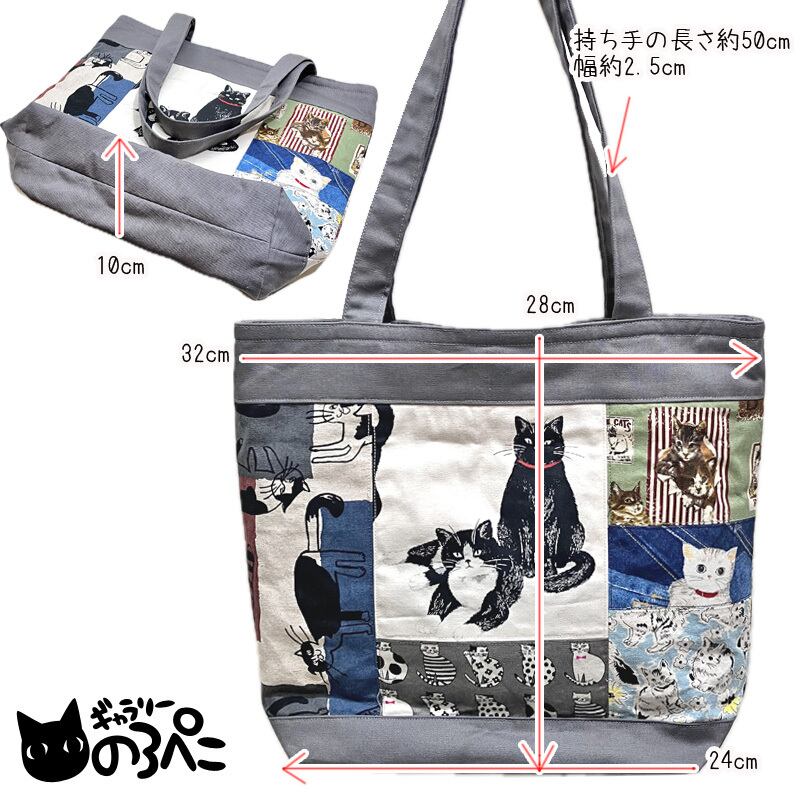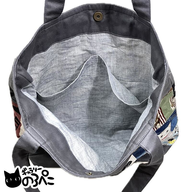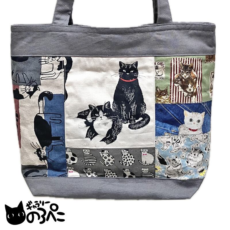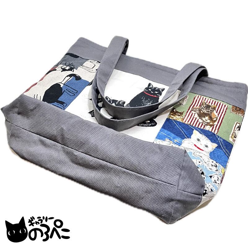 猫ちゃん生地のパッチワークトートバッグ(猫柄生地パッチワーク&帆布のマチ付きトートバッグ・グレー) aa362-496