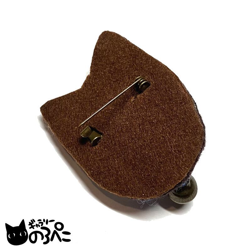 裏側には硬めのハードフェルトを貼り付けてあるので、張りがあってしっかりしています。2.5cmのブローチピン(引っ掛け式)を横向きにつけてあります。